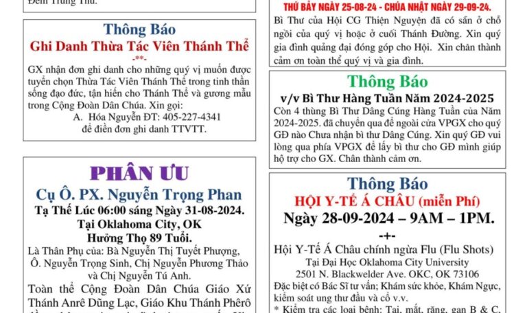 BẢN TIN MỤC VỤ Chúa Nhật 30-6-2024 (Sunday June 30, 2024)