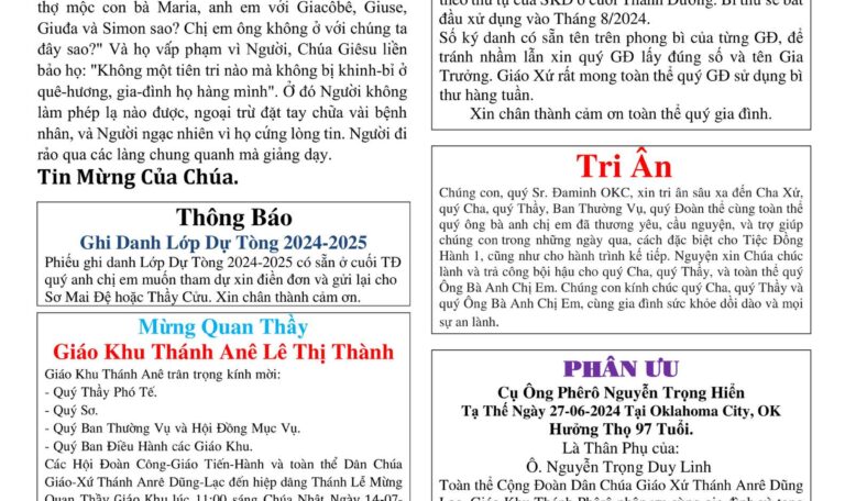 BẢN TIN MỤC VỤ Chúa Nhật Ngày 08-09-2024