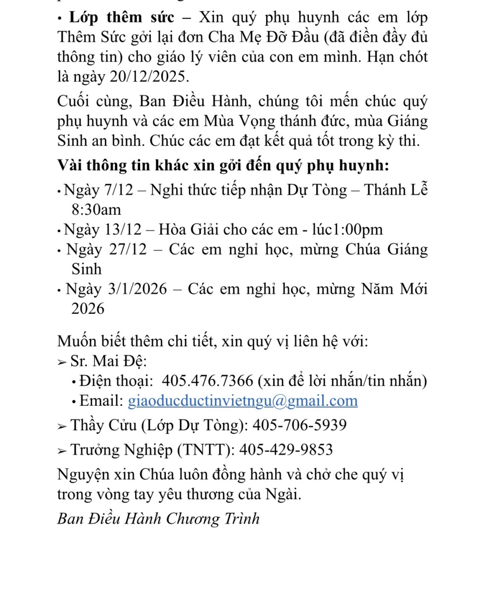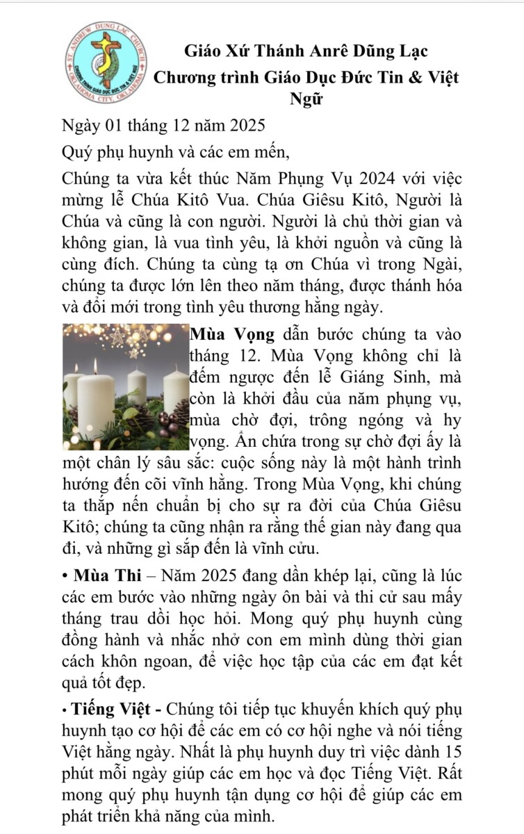 Chương trình Giáo Dục Đức Tin & Việt Ngữ 01-04-2024